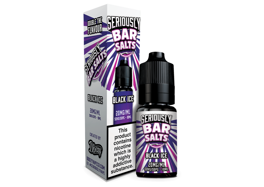 Doozy Seriously Bar Salts E-liquid is available in a 10ml bottle. The VG/PG Percentage Ratio is 50%VG/50%PG and has 20mg Nicotine strength. We use pharmaceutical grade Nicotine which delivers a smooth hit of nicotine, combined with our super tasty flavours delivers an immensely satisfying vape.